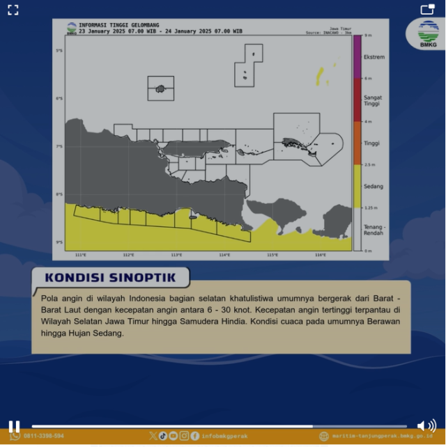 Koordinator Prakirawan BMKG Maritim Tanjung Perak Surabaya, Ady Hermanto, dalam rilisnya di grup info BMKG, Rabu (22/1/2025) mengatakan, salah satu pemicu gelombang tinggi ini adalah karena kecepatan angin. Pola angin di wilayah Indonesia bagian selatan umumnya bergerak dari barat-barat laut dengan kecepatan angin berkisar 6-30 knot