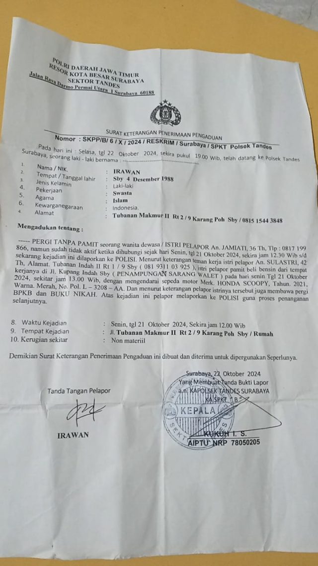 Seorang wanita dewasa bernama Jamiati (38) warga Tubanan Makmur II RT 002 RW 009, Kecamatan Karangpoh Surabaya, dilaporkan pergi tanpa pamit oleh keluarganya. Jamiati sudah pergi meninggalkan rumah beserta suami dan anaknya