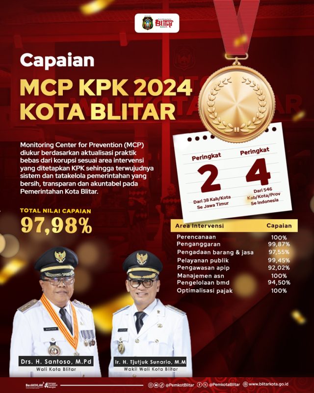 Pemerintah Kota Blitar terus berupaya menciptakan tata kelola pemerintah yang bersih dari praktik korupsi. Komitmen tersebut ditunjukkan melalui hasil Monitoring Center of Prevention (MCP) KPK, yang mana Kota Blitar tahun 2024 memperoleh angka 97,98 persen. Nilai tersebut berhasil membawa Kota Blitar berada di urutan nomor empat se-Indonesia dan nomor dua se-Jawa Timur.