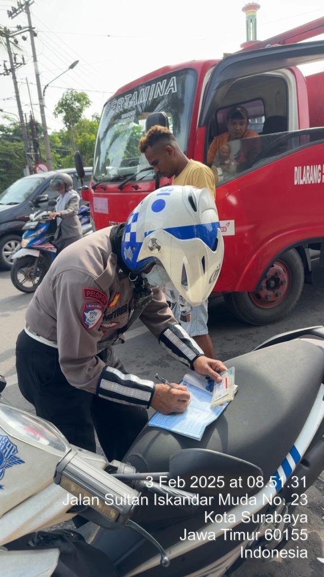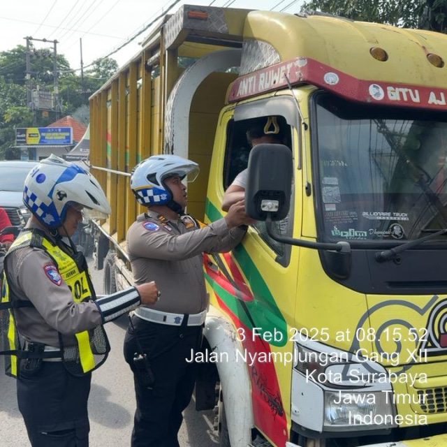 Kepolisian Satuan Lalulintas (Satlantas) Polres Pelabuhan Tanjung Perak dipimpin Kanit Regident Iptu Dodik Nur Susanto melaksanakan kegiatan penindakan pelanggaran lalulintas pembatasan jam larangan melintas di Jalan Iskandar Muda dan Jalan Karang Tembok, Kecamatan Semampir Surabaya, Senin (03/02/2025).