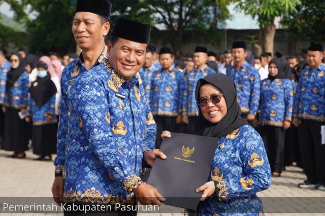 Penjabat (Pj) Bupati Pasuruan, Nurkholis di sela-sela Apel Pagi Karyawan/Karyawati Pemkab Pasuruan, Senin (17/2/2025) secara simbolis menyerahkan Surat Keputusan (SK) Pensiun kepada 26 Pegawai Negeri Sipil (PNS) di Lingkungan Pemerintah Kabupaten Pasuruan yang memasuki masa purna tugas pada Maret 2025 mendatang.