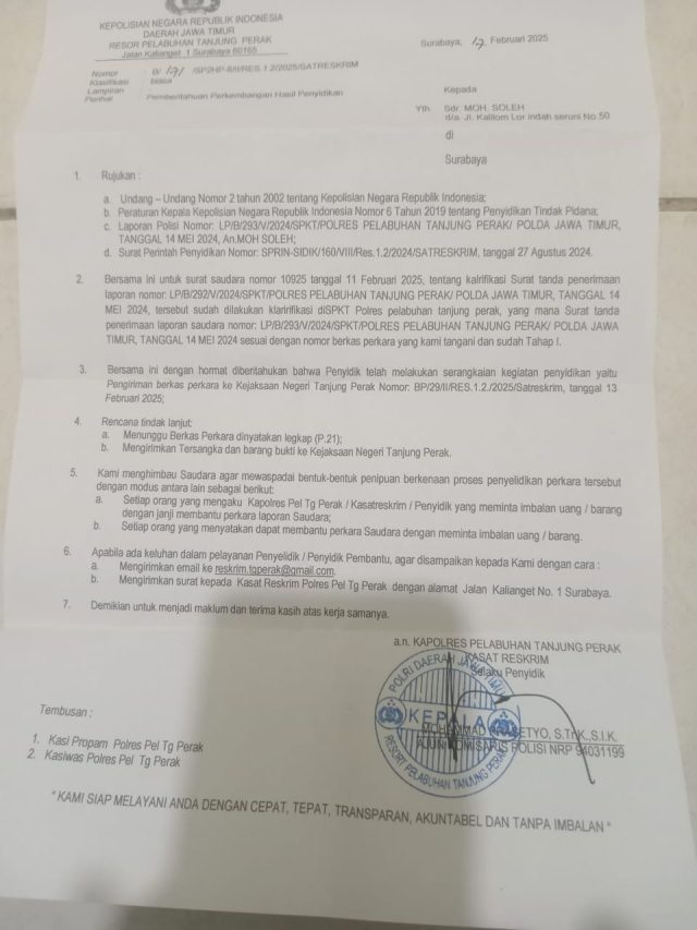 Dalam perkara itu, korban mendapatkan Nomor Laporan Polisi Nomor : B/293/V/SPKT/POLRES PELABUHAN TANJUNG PERAK/POLDA JAWA TIMUR tertanggal 14 Meia 2024. Moch Soleh juga sudah mendapatkan Surat Pemberitahuan Perkembangan Hasil Penyelidikan (SP2HP) dari Satreskrim Polres Pelabuhan Tanjung Perak dengan Nomor : B /7/SP2HP-8/II/RES/1.2/2025/SATRESKRIM pertanggal 17 Februari 2025.