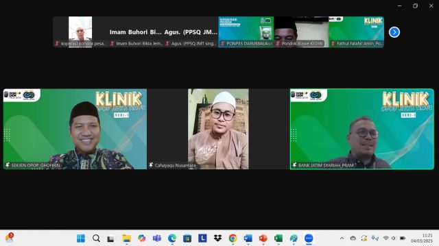 Klinik OPOP Jawa Timur hadir sebagai jawaban atas beragam tantangan yang dihadapi oleh 1.420 pesantren peserta One Pesantren One Product (OPOP) di seluruh Jawa Timur. Pada sesi perdana yang digelar secara online hari ini, sebanyak 140 pesantren anggota OPOP turut serta dalam diskusi. Acara ini dihadiri oleh Mohammad Ghofirin, Sekretaris OPOP Jawa Timur, serta perwakilan dari Bidang Kelembagaan dan Pengawasan, Bidang Produksi, Bidang Pemasaran, Bidang Pembiayaan dan UPT Pelatihan Dinas Koperasi dan UKM Provinsi Jawa Timur.