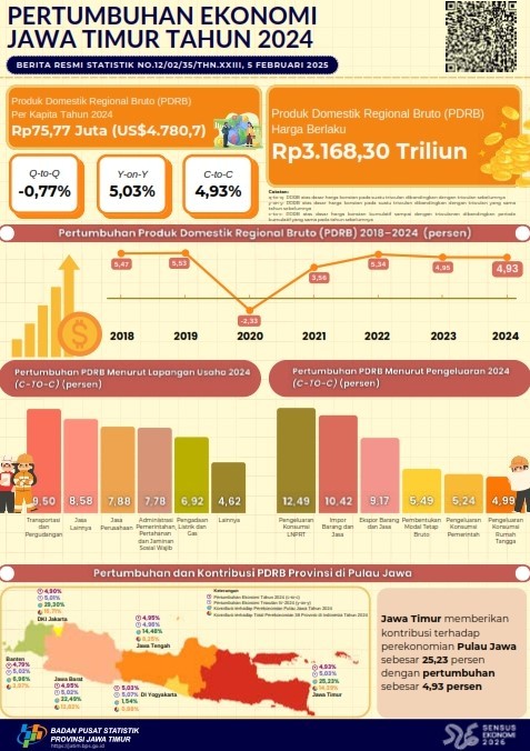 Provinsi Jawa Timur pada Februari 2025 mengalami deflasi atau penurunan harga secara year-on-year (y-on-y) sebesar 0,03 persen. Deflasi tersebut, menurut Kepala Badan Pusat Statistik Provinsi Jawa Timur (BPS Jatim) Zulkipli, disebabkan dari akibat kebijakan diskon dari pemerintah melalui PT PLN (Persero).