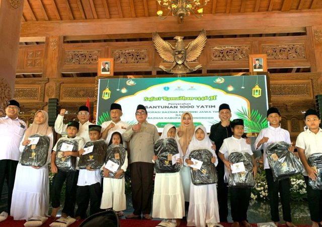 Badan Amil Zakat Nasional Provinsi Jawa Timur mengadakan santunan bagi 1.000 anak yatim dalam rangkaian kegiatan Safari Ramadan 1446 H. Acara ini digelar di Pendopo Agung Ponorogo, Sabtu (8/3/2025).