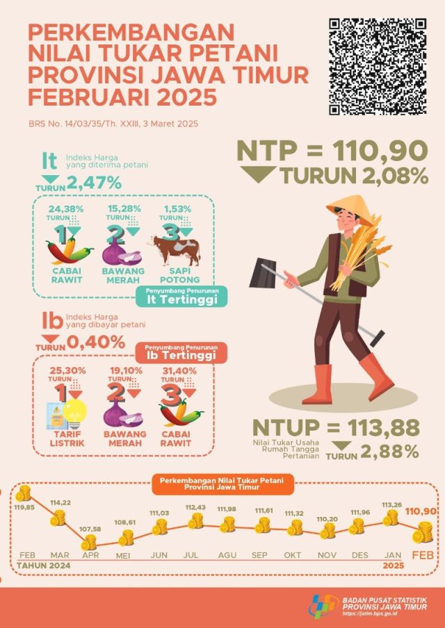 Tak hanya NTP, Zulkipli membeberkan, BPS Jatim juga mengukur Nilai Tukar Usaha Pertanian (NTUP) yang pada Februari 2025 juga mengalami penurunan sebesar 2,88 persen.