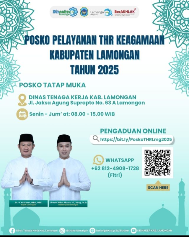 Pemerintah Kabupaten Lamongan melalui Dinas Tenaga Kerja (Disnaker) membuka posko pengaduan tunjangan hari raya (THR), yang bertujuan untuk memastikan hak pekerja.