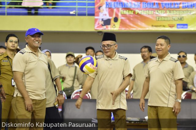 Sebanyak 50 lembaga SMP negeri maupun swasta di Kabupaten Pasuruan mengikuti turnamen Turnamen Bola Voli Bupati Cup tingkat SMP.di GOR Sasana Krida Anoraga Raci Bangil, Senin (28/4/2025) yang dibuka oleh Wakil Bupati Pasuruan, Shobih Asrori.