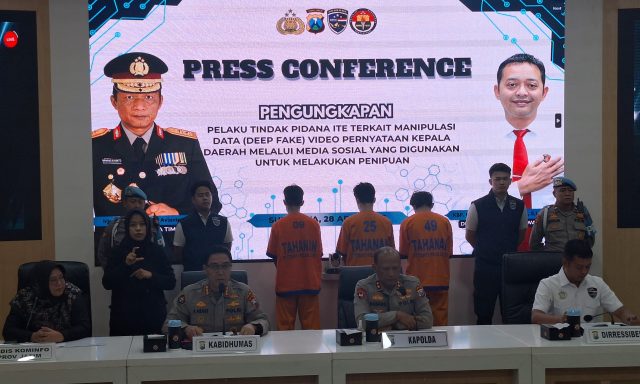 Direktorat Tindak Pidana Siber (Dittipidsiber) Polda Jawa Timur menggelar konferensi pers terkait pengungkapan kasus kejahatan siber berupa manipulasi data menggunakan teknologi kecerdasan buatan (AI), Senin (28/4/2025). Kasus ini melibatkan penggunaan teknologi deepfake untuk memalsukan pernyataan video kepala daerah yang kemudian disebarkan melalui media sosial sebagai modus penipuan.
