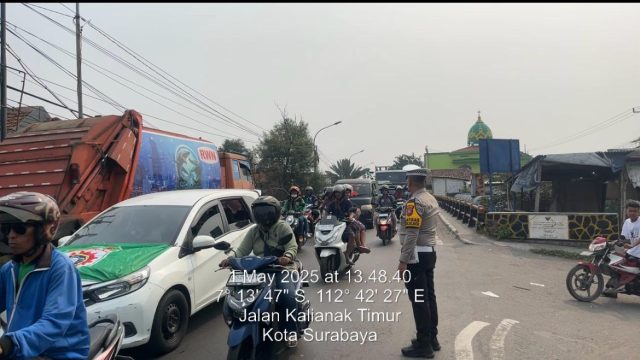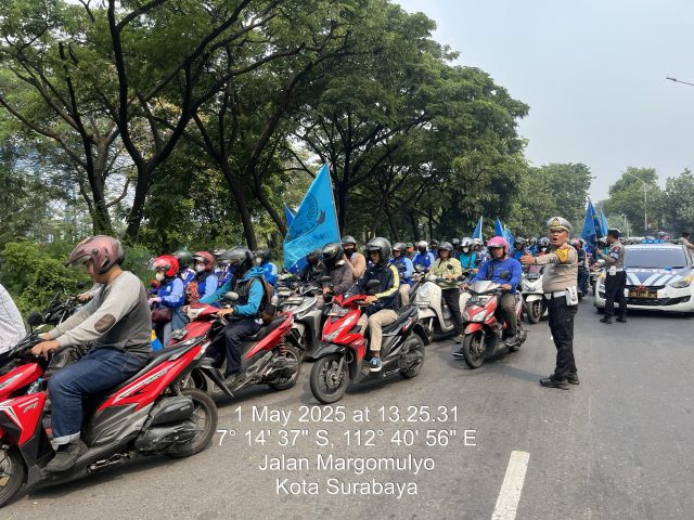 Kasat Lantas Polres Pelabuhan Tanjung Perak AKP Imam Syaifuddin Rodji pimpin langsung PAM pengamanan jalur aksi Unjuk Rasa (UNRAS) para buruh yang sedang memperingati May Day dan menuju ke Kantor Gubernur, Jawa Timur, Kamis 01 Mei 2025 siang. Kok