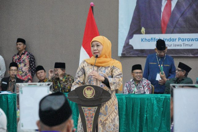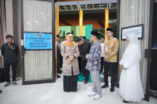Gubernur Jawa Timur, Khofifah Indar Parawansa, menyapa para jemaah haji yang tergabung dalam Kelompok Terbang (Kloter) pertama Embarkasi Surabaya di Hall Musdalifah Jumat (2/5/2025) dini hari. Pada momen itu, Gubernur Khofifah berpesan kepada jemaah agar mendoakan keamanan dan keselamatan Indonesia, terutama di Jawa Timur.