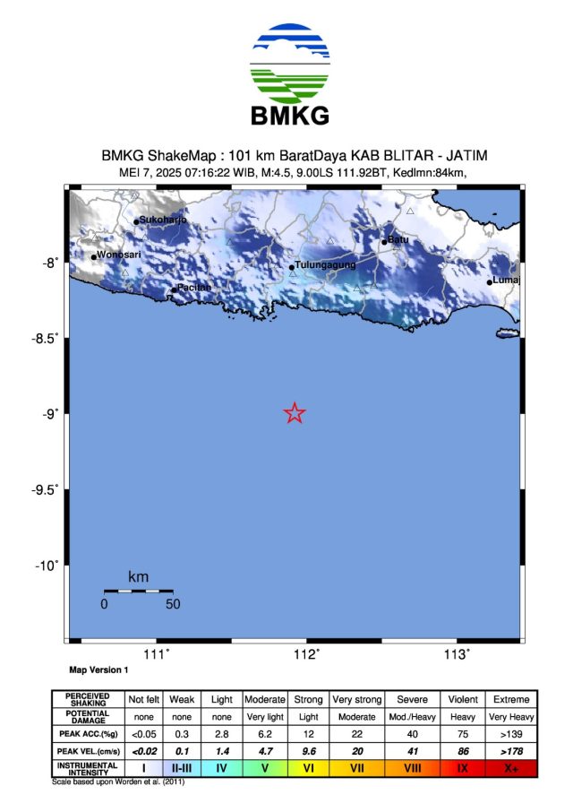 Kepala Stageof BMKG Sleman, Ardhianto Septiadhi, dalam keterangannya, menyampaikan, guncangan gempabumi ini dirasakan di daerah Blitar III MMI (Modified Mercally Intensity atau Getaran dirasakan seperti truk yang melintas,red).
