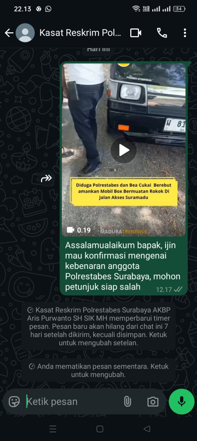 ‘Datanglah mobil innova hitam dikendarai oknum mengaku dari polrestabes untuk mengintervensi petugas beacukai madura, sempat terjadi perdebatan hingga akhirnya oknum polisi tersebut memaksa untuk membawa kabur kendaraan bermuatan rokok tersebut ke arah surabaya’.