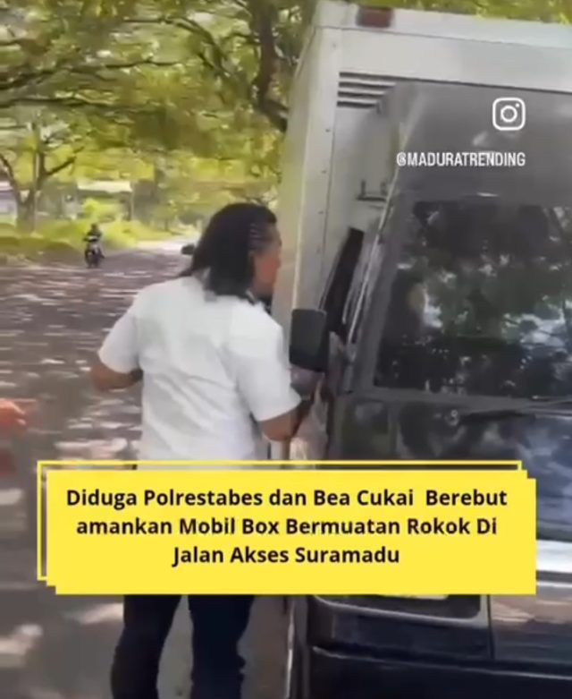 Dalam video berdurasi 15 detik yang diunggah di media sosial Instagram oleh akun @maduratrending, terdapat keterangan ‘Diduga Polrestabes Surabaya dan Bea Cukai berebut amankan mobil box bermuatan rokok di Jalan Akses Surabaya’.