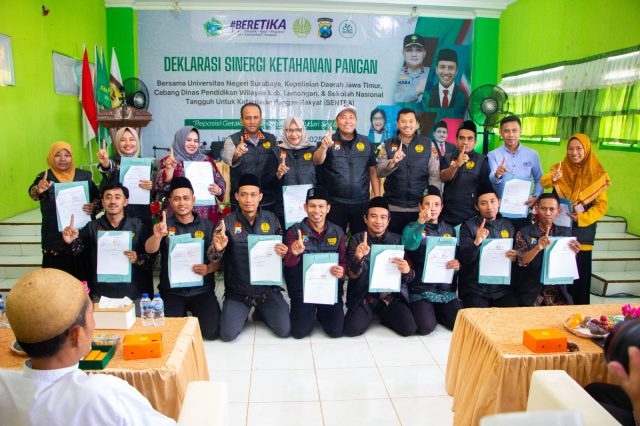 Universitas Negeri Surabaya (Unesa) bersama Polda Jawa Timur, Cabang Dinas Pendidikan Wilayah Kabupaten (Cabdindik) Lamongan, dan Sekolah Nasional Tangguh untuk Ketahanan Pangan Rakyat (Sentra) mendeklarasikan sinergi ketahanan pangan di MTs. Miftahul Ulum Solokuro, Lamongan.