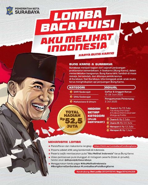 Pemerintah Kota Surabaya menggelar lomba baca puisi “Aku Melihat Indonesia” karya Bung Karno, dengan total hadiah Rp52,5 juta. Lomba ini terbuka untuk pelajar SMP, SMA, mahasiswa, dan masyarakat umum.