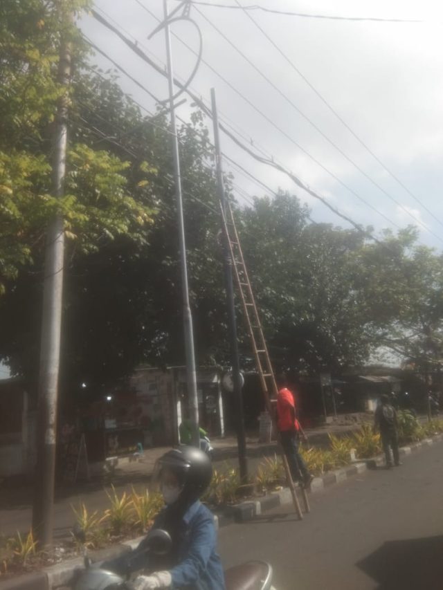 Kasi Trantib Kelurahan Simokerto tindak lanjuti adanya pemasangan tiang WiFi atau jaringan utilitas milik Linknet yang diduga tidak mempunyai ijin dari Dinas Pekerjaan Umum (PU) Kota Surabaya di Jalan Sidoyoso.