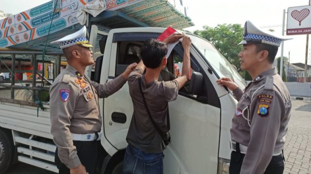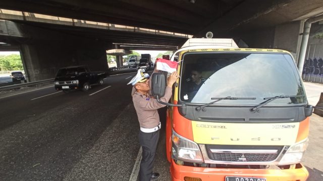 Menyambut Hari Ulang Tahun (HUT) RI ke-80. Direktorat Lalu Lintas (Ditlantas) Polda Jatim, membagikan ratusan bendera merah putih ke sopir truk yang dilaksanakan di Jalan Raya Surabaya-Sidoarjo.
