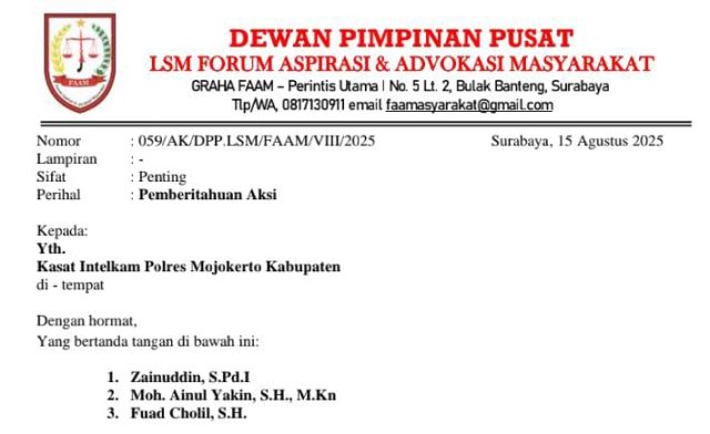 Zainuddin, S.Pd.I, selaku Sekjen Membenarkan kalau DPP Lembaga LSM FAAM beralamat Perintis Utama I No. 5 Lt. 2, Bulak Banteng, Surabaya, akan gelar aksi didepan Polres Kabupaten Mojokerto.