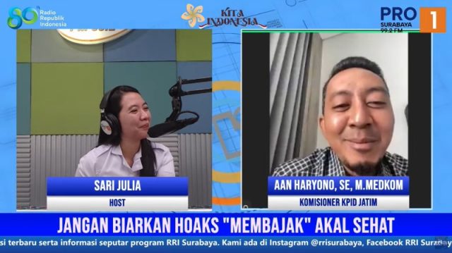 Dinas Komunikasi dan Informatika (Kominfo) Jawa Timur menegaskan pentingnya peningkatan literasi digital sebagai benteng utama melawan hoaks yang semakin marak di era arus informasi tanpa batas. Hal itu disampaikan dalam program siaran RRI Surabaya bertajuk “Jangan Biarkan Hoaks Membajak Akal Sehat” yang menghadirkan para pakar komunikasi dan pemerhati media.