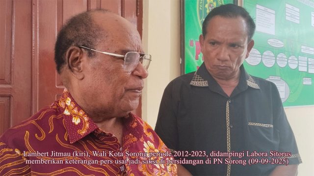 Papua Barat Daya – Mantan Wali Kota Sorong dua periode, Lambert Jitmau, hadir di ruang sidang Pengadilan Negeri (PN) Sorong pada Selasa, 09 September 2025. Lambert Jitmau dihadirkan untuk memberikan kesaksian dan keterangan tentang dokumen izin reklamasi yang diklaim sebagai alas hak Paulus George Hung alias Ting-ting Ho alias Mr. Ching atas tanah yang disengketakan di PN Sorong yang dikenal dengan kasus “Tipu-tipu Abunawas”.