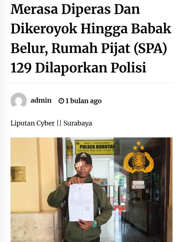 “Saat di resepsonis, saya ditawari pijat plus-plus,” ungkapnya dalam pemberitaan sebelumnya ketika korban selesai melapor ke Polsek Bubutan.