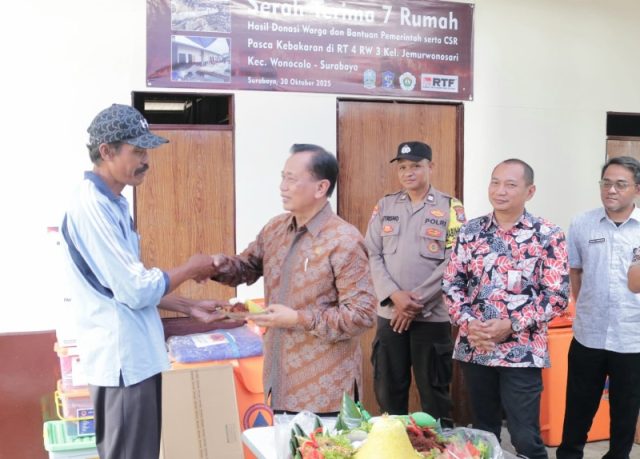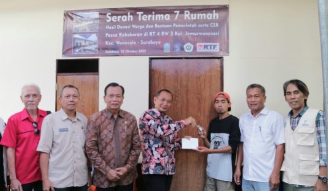 Tujuh unit rumah warga terdampak kebakaran di kawasan Jemursari, Surabaya, tuntas dibangun dan kunci resmi diserahkan kepada pemiliknya, Senin (3/11/2025). Pembangunan rumah tersebut merupakan hasil donasi berbagai pihak dan dikoordinasikan oleh Badan Penanggulangan Bencana Daerah (BPBD) Jawa Timur.