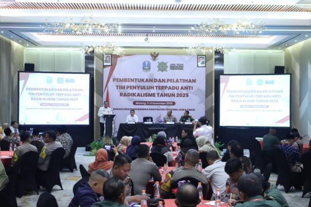 Pemerintah Provinsi Jawa Timur melalui Badan Kesatuan Bangsa dan Politik (Bakesbangpol) menggelar kegiatan Pembentukan dan Pelatihan Tim Penyuluh Terpadu Anti Radikalisme Tahun 2025 di Kota Malang, Rabu (3/12/2025). Kegiatan ini dibuka Kepala Bakesbangpol Jawa Timur, Eddy Supriyanto, dan diikuti ratusan peserta yang terdiri dari penyuluh agama, Babinsa, Bhabinkamtibmas, serta perwakilan pemerintah daerah.