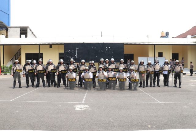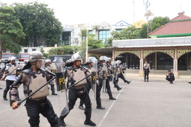 Bukan sekadar peninjauan, AKBP Wahyu Hidayat ikut membaur, mengangkat tameng, dan melakukan simulasi formasi pengamanan massa.
