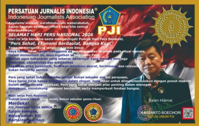 Ketua Umum Persatuan Jurnalis Indonesia (PJI), Hartanto Boechori, menyampaikan ucapan Selamat Hari Pers Nasional (HPN) 2026 kepada seluruh insan pers di Indonesia.